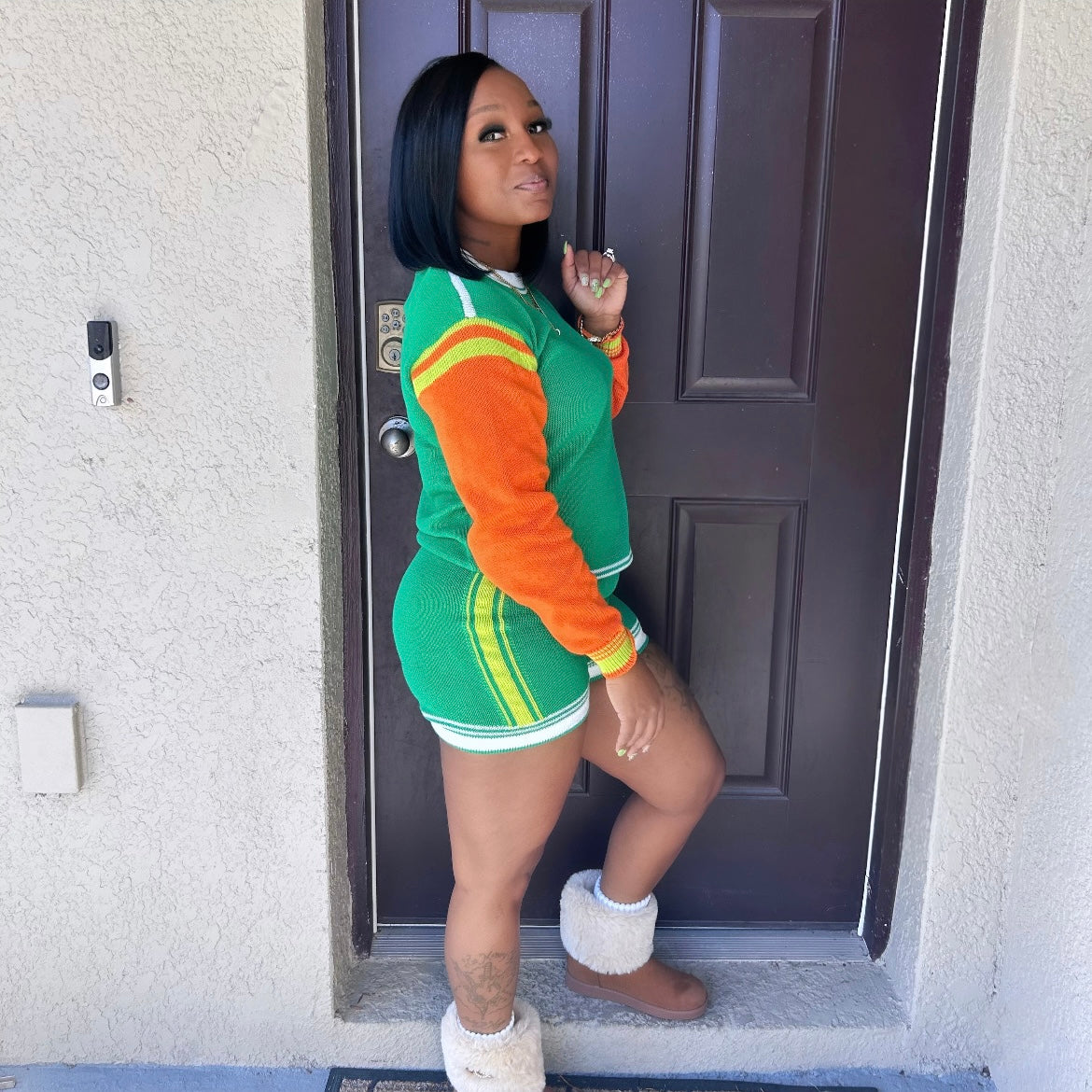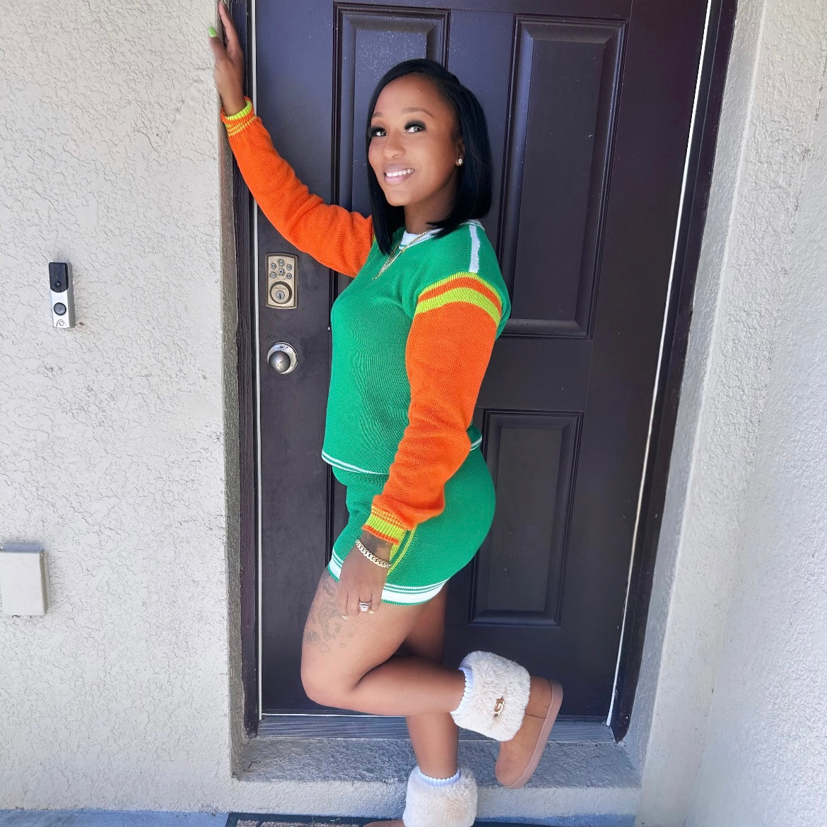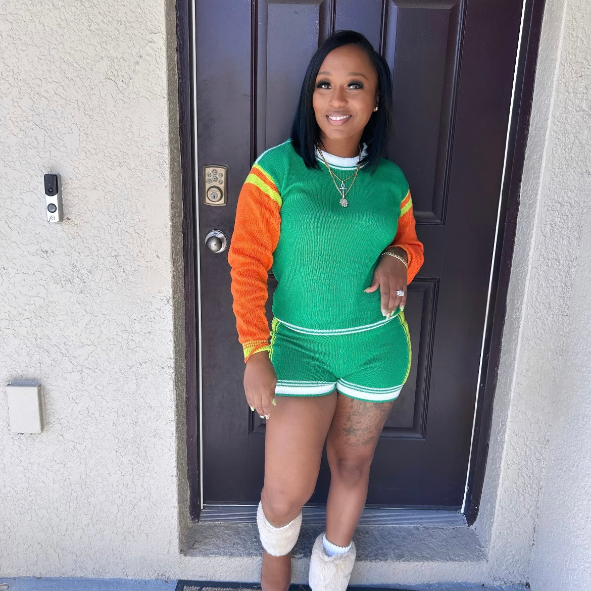This sweater shorts and long-sleeved shirt combo is fashionable and will keep you feeling cozy. Set does have some stretch. True to size